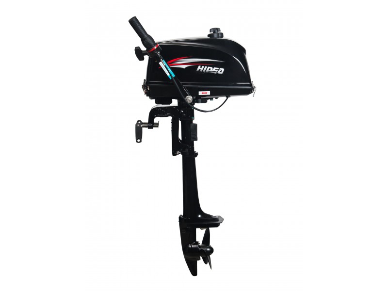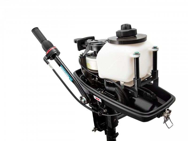 Двухтактный карбюраторный мотор от лучшего китайского производителя водомоторной техники. Бензиновый двигатель с одним цилиндром вырабатывает до 3 лошадиных сил и до 5500 об/минуту. Мотор имеет центробежное сцепление (т.е. начинает двигаться при открытии ручки газа и останавливается при её закрытии). В корпусе мотора находится встроенный бак, емкостью 1,2 литра. Выхлоп мотора осуществляется под воду, что делает прогулки на воде тихими и приятными. Мотор имеет режим мелководья.